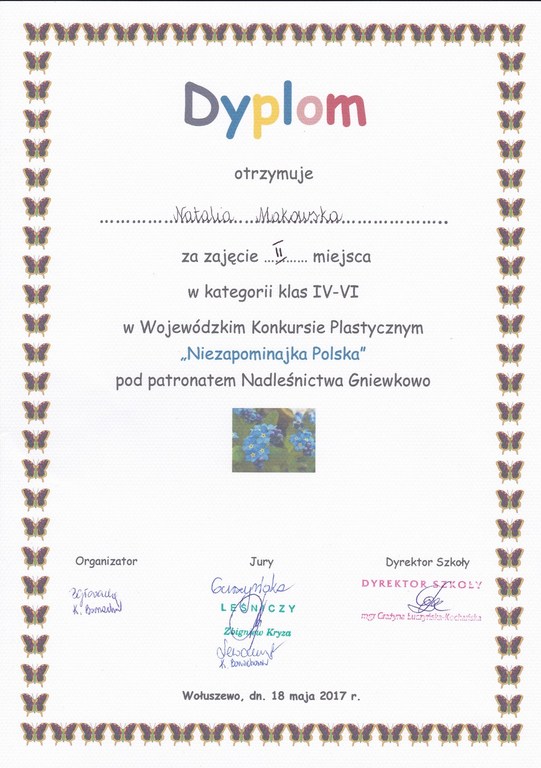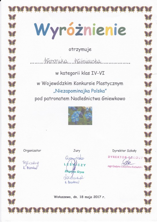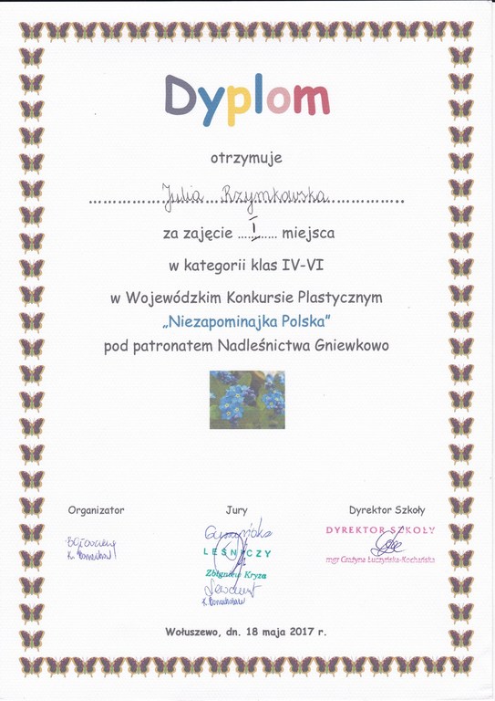 Uczniowie naszej szkoły z powodzeniem brali udział w Wojewódzkim Konkursie Plastycznym "Niezapominajka Polska" zorganizowanym przez Publiczną Szkołę Podstawową w Wołuszewie, pod patronatem Nadleśnictwa Gniewkowo.